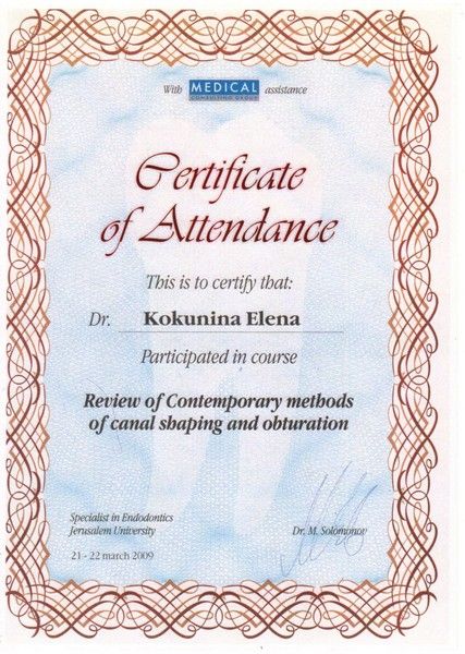 Прослушала курс лекции по эндодонтии Medical consulting Group (Москва) и прошла теоретический и практический курс по оперативному микроскопу Tel Aviv, Israel (Михаил Соломонов) 2008-2010 г.